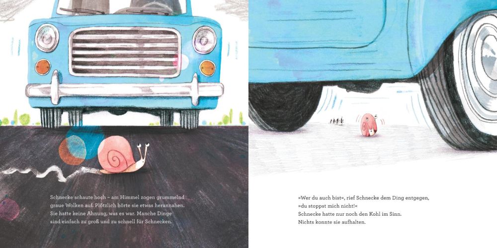 Lecker! Als Schnecke auf der anderen Straßenseite grüne Kohlköpfe erspäht, ist klar: Nichts und niemand kann sie aufhalten! Unbeirrt kriecht sie auf ihr Ziel zu und trotzt allen Gefahren. Als es zu regnen beginnt, lädt sie eine Gruppe verängstigter Ameisen zum Tee in ihr Schneckenhaus ein. So viel Zeit muss sein! Nach dem Schauer kriecht Schnecke entschlossen weiter. Doch dann gibt es eine böse Überraschung. Muss Schnecke etwa auf den Kohl verzichten?