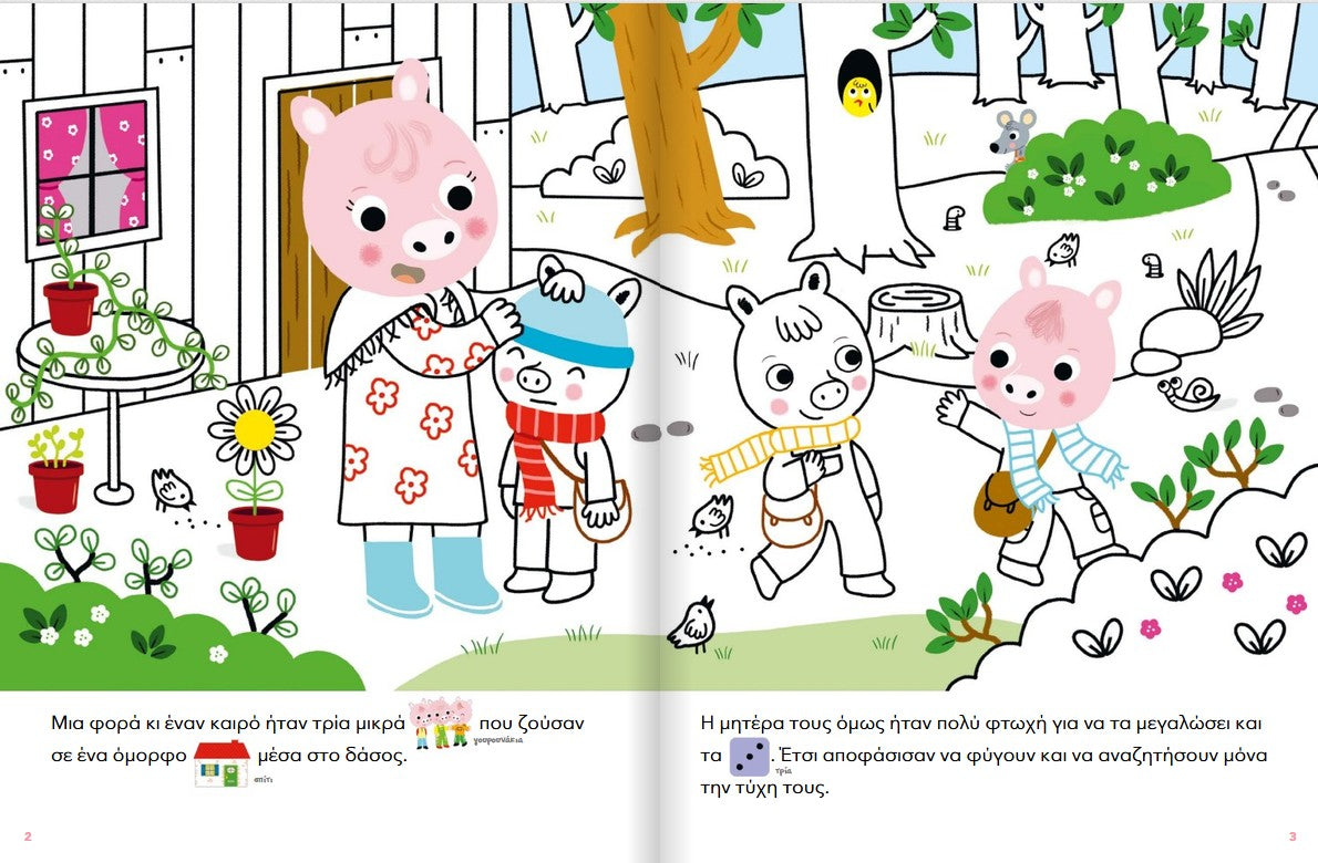 Die drei kleinen Schweinchen als Bilderbuch mit Piktogrammen auf Griechisch - mit Ausmalseiten und Stickern - das werden Ihre Kinder lieben!