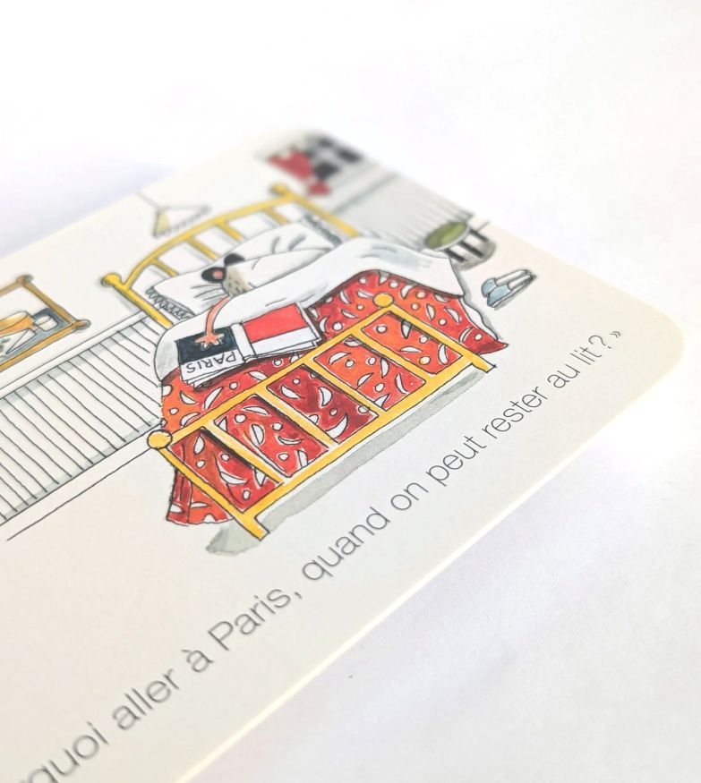 Avez-vous déjà vu dix petites souris s’en aller à Paris? Après la lecture de ce tout-carton, ce sera chose faite… ou presque! Bien que pleines de bonne volonté, les dix petites héroïnes auront de la peine à mener leur voyage à terme. Chacune d’elles semble avoir une bonne raison pour abandonner le reste de la troupe: la pluie décourage Marceline, les bruits effraient Ernestine, ou encore Sabine réalise qu’elles ne partent pas au ski mais bien à Paris. L’une d’elles réussira-t-elle à se rendre à Paris?