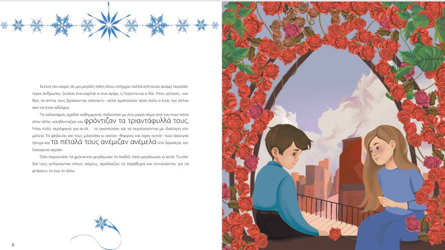 Όταν τα μικρά κομμάτια ενός σπασμένου, μαγικού καθρέφτη μπαίνουν στην καρδιά και στα μάτια του μικρού Κάι, ξεχνά όλα τα αγαπημένα του πρόσωπα και κυρίως τη φίλη του την Γκέρντα. Κάπως έτσι, παίρνει το έλκηθρό του και ακολουθεί τη Βασίλισσα του Χιονιού, καταλήγοντας φυλακισμένος στο παλάτι της, με την καρδιά του παγωμένη. Η Γκέρντα φτάνει ως την άκρη του κόσμου για να τον βρει και, όταν επιτέλους έρχεται εκείνη η στιγμή, τα δάκρυά της λιώνουν τους πάγους μέσα του. Ο Κάι ξαναβρίσκει τη μνήμη του και τα συναισθήματά του και μαζί επιστρέφουν στα σπίτια τους για να φροντίσουν τα αγαπημένα τους τριαντάφυλλα.