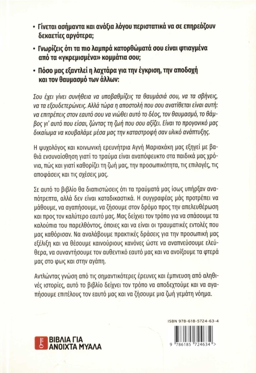 Σε αυτό το βιβλίο θα διαπιστώσεις ότι τα τραύματά μας ίσως υπήρξαν αναπότρεπτα, αλλά δεν είναι καταδικαστικά. Η συγγραφέας μάς προτρέπει να μάθουμε, να αγαπήσουμε, να ζήσουμε στον δρόμο προς την απελευθέρωση και προς τον καλύτερο εαυτό μας. Μας δείχνει τον τρόπο για να σπάσουμε τα καλούπια του παρελθόντος, όποιες και να είναι οι τραυματικές εντολές που μας καθόρισαν. Να αναλάβουμε πρακτικές δράσεις για την προσωπική μας εξέλιξη και να θέσουμε καινούριους κανόνες ώστε να αναπνεύσουμε ελεύθερα, να συναντήσουμε τον αυθεντικό εαυτό μας και να ανοίξουμε τα φτερά μας στο φως και στην αγάπη.