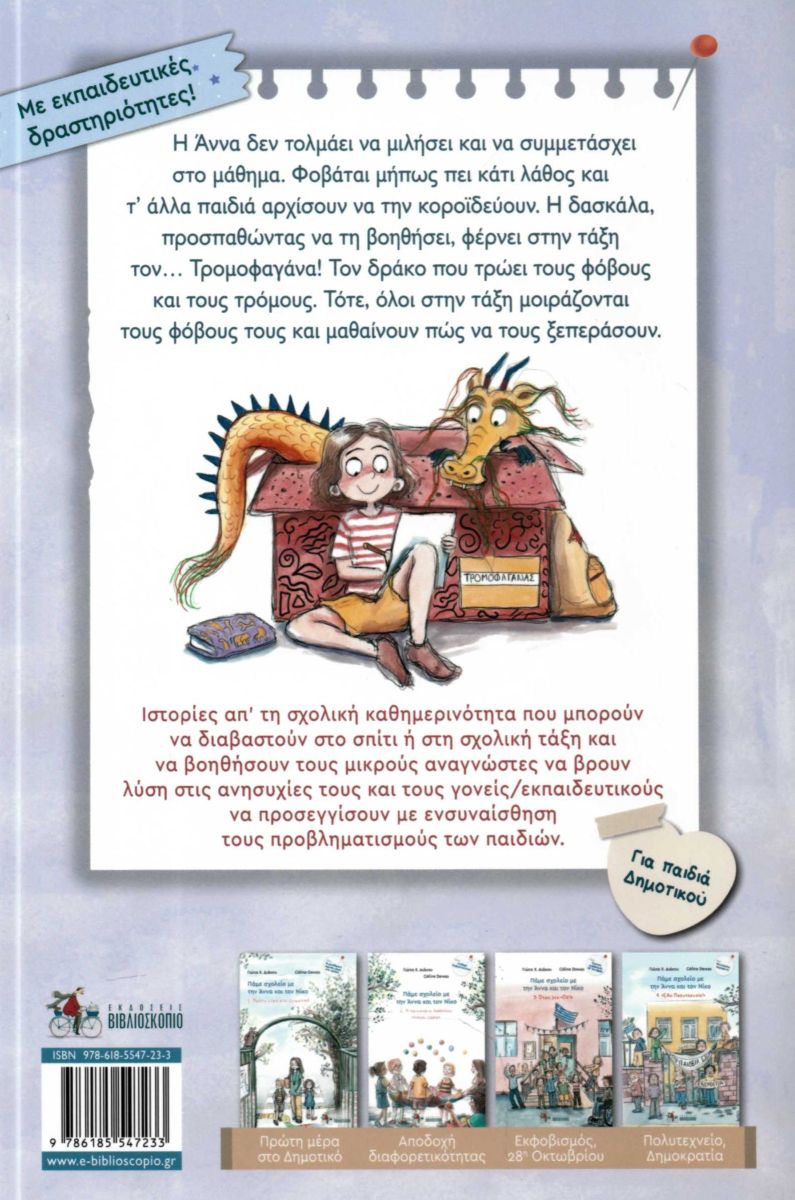 Ιστορίες απ' τη σχολική καθημερινότητα που μπορούν να διαβαστούν στο σπίτι ή στη σχολική τάξη και να βοηθήσουν τους μικρούς αναγνώστες να βρουν λύση στις ανησυχίες τους και τους γονείς/ εκπαιδευτικούς να προσεγγίσουν με ενσυναίσθηση τους προβληματισμούς των παιδιών.