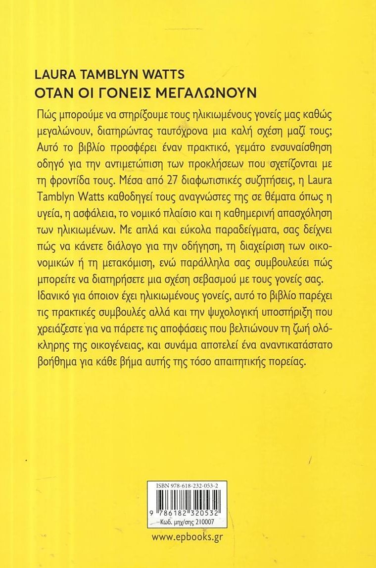 Ιδανικό για όποιον έχει ηλικιωμένους γονείς, αυτό το βιβλίο παρέχει τις πρακτικές συμβουλές αλλά και την ψυχολογική υποστήριξη που χρειάζεστε για να πάρετε τις αποφάσεις που βελτιώνουν τη ζωή ολόκληρης της οικογένειας, και συνάμα αποτελεί έναν αναντικατάστατο βοήθημα για κάθε βήμα αυτής της τόσο απαιτητικής πορείας.
