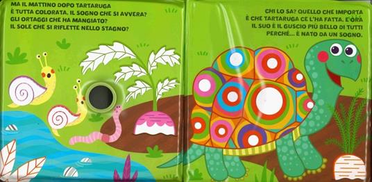 Tartaruga ha un sogno: un guscio multicolore. Per questo continua a mangiar, ortaggi verdi, arancioni, viola. Ad ogni bagnetto, con l'acqua, le immagini si riempiono di mille colori, per poi tornare bianche una volta asciutte.