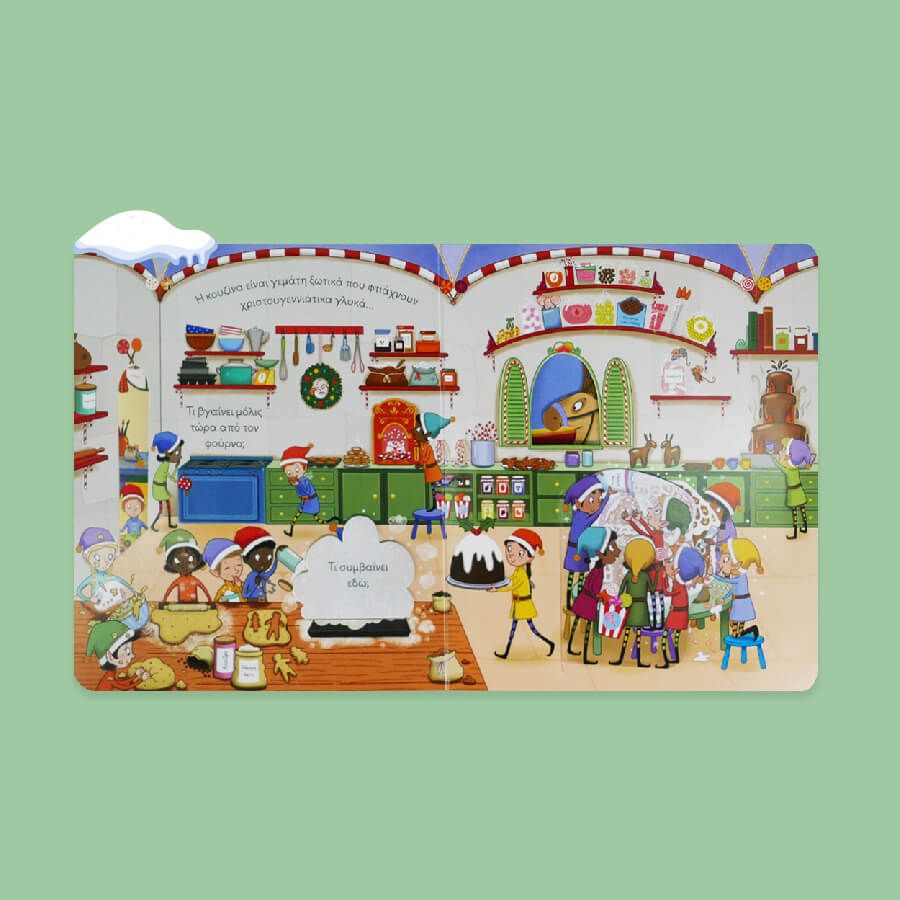 Ρίξε μια ματιά σε αυτό το μαγικό χειμωνιάτικο τοπίο και ανακάλυψε ξωτικά που φτιάχνουν παιχνίδια, τον Αϊ-Βασίλη που πετά στο έλκηθρό του και όλη τη μαγεία των Χριστουγέννων.
