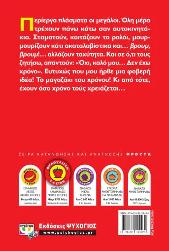 Περίεργα πλάσματα οι μεγάλοι. Όλη μέρα τρέχουν πάνω κάτω σαν αυτοκινητάκια. Σταματούν, κοιτάζουν το ρολόι, μουρμουρίζουν κάτι ακαταλαβίστικα και… βρουμ, βρουμ!... αλλάζουν ταχύτητα. Και σε ό,τι τους ζητήσω, απαντούν: «Όχι, καλό μου… Δεν έχω χρόνο». Ευτυχώς που μου ήρθε μια φοβερή ιδέα! Το μαγαζάκι του χρόνου! Κι από τότε, έχουν όσο χρόνο τούς χρειάζεται…