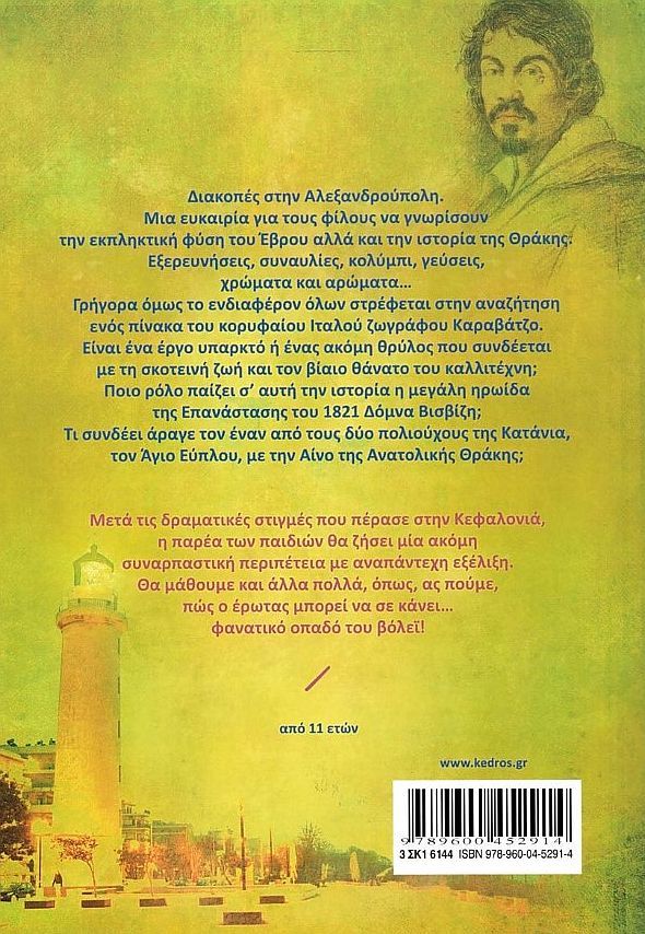 Διακοπές στην Αλεξανδρούπολη. Μια ευκαιρία για τους φίλους να γνωρίσουν την εκπληκτική φύση του Έβρου αλλά και την ιστορία της Θράκης. Εξερευνήσεις, συναυλίες, κολύμπι, γεύσεις, χρώματα και αρώματα… Γρήγορα όμως το ενδιαφέρον όλων στρέφεται στην αναζήτηση ενός πίνακα του κορυφαίου Ιταλού ζωγράφου Καραβάτζο. Είναι ένα έργο υπαρκτό ή ένας ακόμη θρύλος που συνδέεται με τη σκοτεινή ζωή και τον βίαιο θάνατο του καλλιτέχνη; Ποιο ρόλο παίζει σ’ αυτή την ιστορία η μεγάλη ηρωίδα της Επανάστασης του 1821 Δόμνα Βισβίζη; Τι συνδέει άραγε τον έναν από τους δύο πολιούχους της Κατάνια, τον Άγιο Εύπλου, με την Αίνο της Ανατολικής Θράκης;