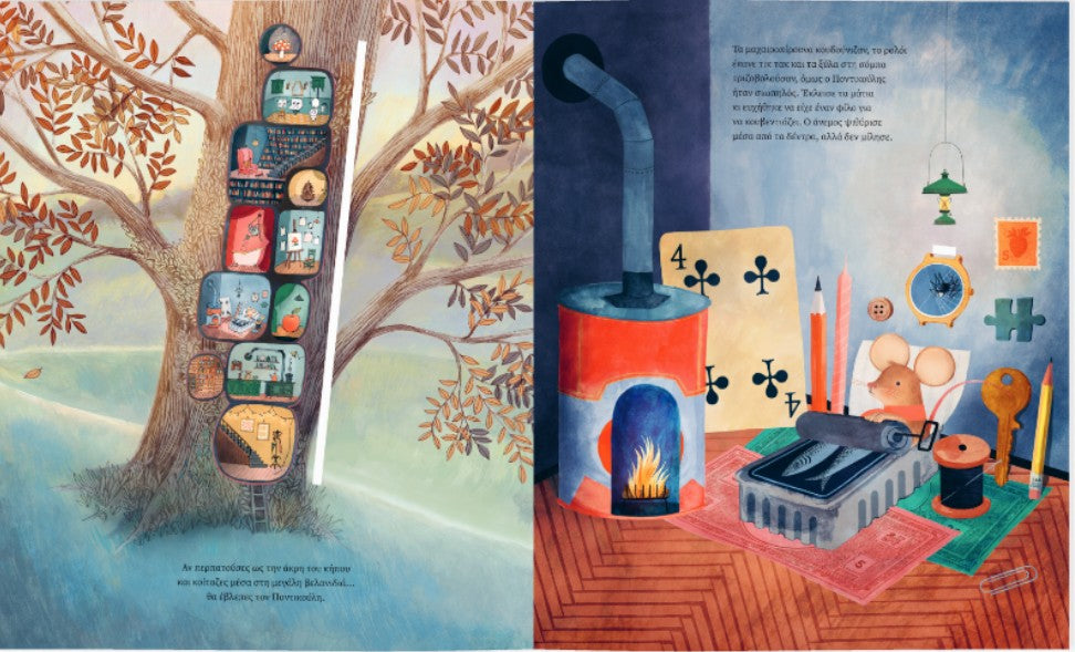 Αν περπατούσες ως την άκρη του κήπου και κοίταζες μέσα στη μεγάλη βελανιδιά… θα έβλεπες τον Ποντικούλη. Όταν μια θύελλα έριξε τη βελανιδιά, η Ολίβια προσπάθησε να βρει ένα καινούριο σπιτάκι για τον μικρό φίλο της. Θα μπορούσε να μείνει μέσα σε μια τσαγιέρα ή σ’ ένα ρολόι με κούκο ή σε μια μεγάλη μπότα… Θα έβρισκε όμως ένα αληθινά ζεστό και φιλόξενο σπιτικό;