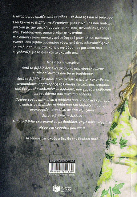 Η ιστορία μου αρχίζει από το τέλος – το δικό της και το δικό μου. Έτσι ξεκινά το Βιβλίο της Κατερίνας, μιας γυναίκας που πάλεψε μια ζωή με την ψυχική αρρώστια, και που, αν νικήθηκε, έζησε και μεγαλούργησε ταπεινά χάρη στην αγάπη. Μια οικογενειακή σάγκα γεμάτη ζοφερά μυστικά και θανάσιμες ενοχές, ένα βιβλίο μυστηρίου γύρω από έναν αδιανόητο φόνο και τα δυο του θύματα, και μια κατάδυση σε μια ψυχή που συγκλονίζει με το φως και το σκοτάδι της.