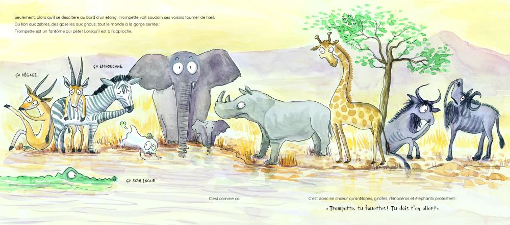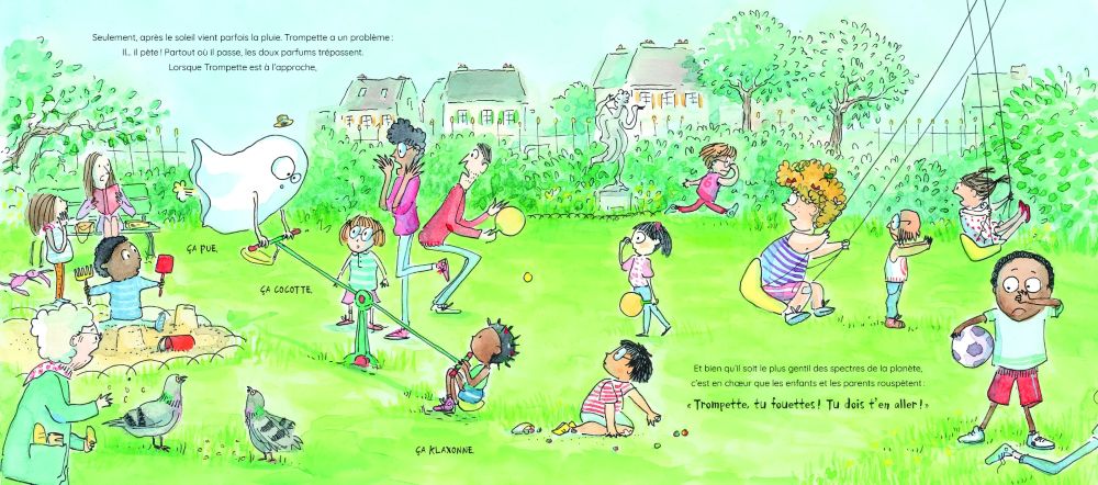 Mais Trompette est avant tout un fantôme... qui pète ! Sur son passage, tout le monde fuit et plisse le nez. Le voilà décidé : il fait sa valise et part vers d'autres contrées. Arrivera-t-il à trouver un endroit dans le monde où ses odorantes effluves ne dérangeront pas ses habitants ?