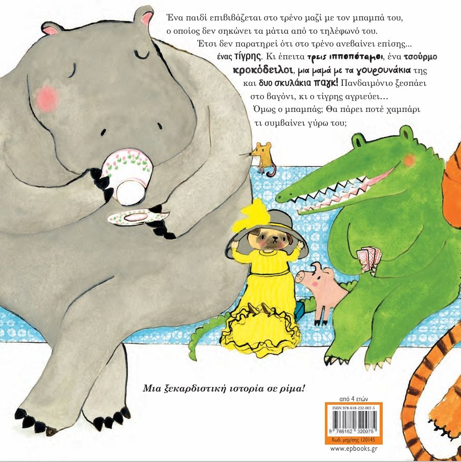 Ένα παιδί επιβιβάζεται στο τρένο μαζί με τον μπαμπά του, ο οποίος δεν σηκώνει τα μάτια από το τηλέφωνο του. Έτσι δεν παρατηρεί ότι στο τρένο ανεβαίνει επίσης… ένας τίγρης. Κι έπειτα τρεις ιπποπόταμοι, ένα τσούρμο κροκόδειλοι, μια μαμά με τα γουρουνάκια της και δύο σκυλάκια παγκ! Πανδαιμόνιο ξεσπάει στο βαγόνι, κι ο τίγρης αγριεύει… Όμως ο μπαμπάς; Θα πάρει ποτέ χαμπάρι τι συμβαίνει γύρω του;